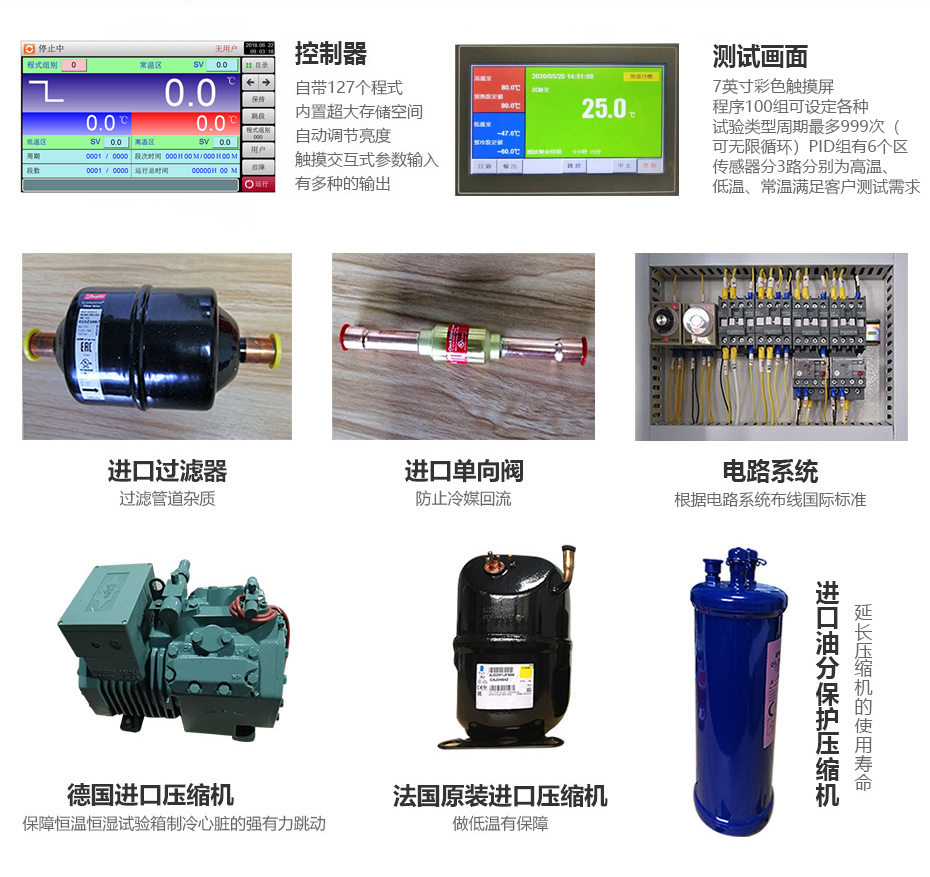安全保护措施 电源欠压、过压、缺相、相序错误保护;三重超温保护;加热器短路保护;制冷机超压,过载保护鼓风电机过载,过热保护;控制板过流保护;漏电保护