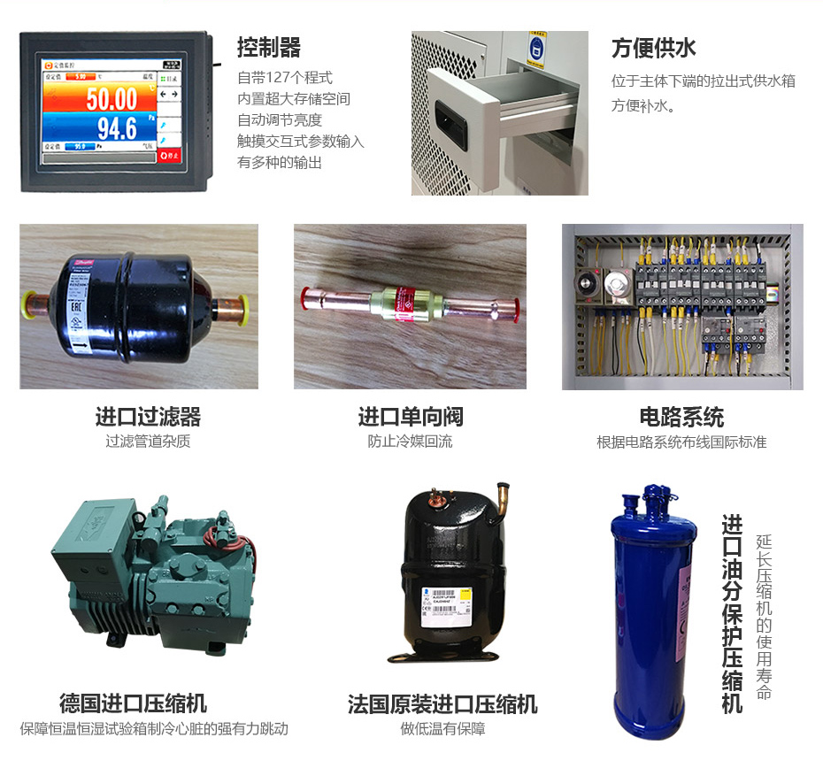 安全保护措施 电源欠压、过压、缺相、相序错误保护;三重超温保护;加热器短路保护;制冷机超压,过载保护鼓风电机过载,过热保护;控制板过流保护;漏电保护