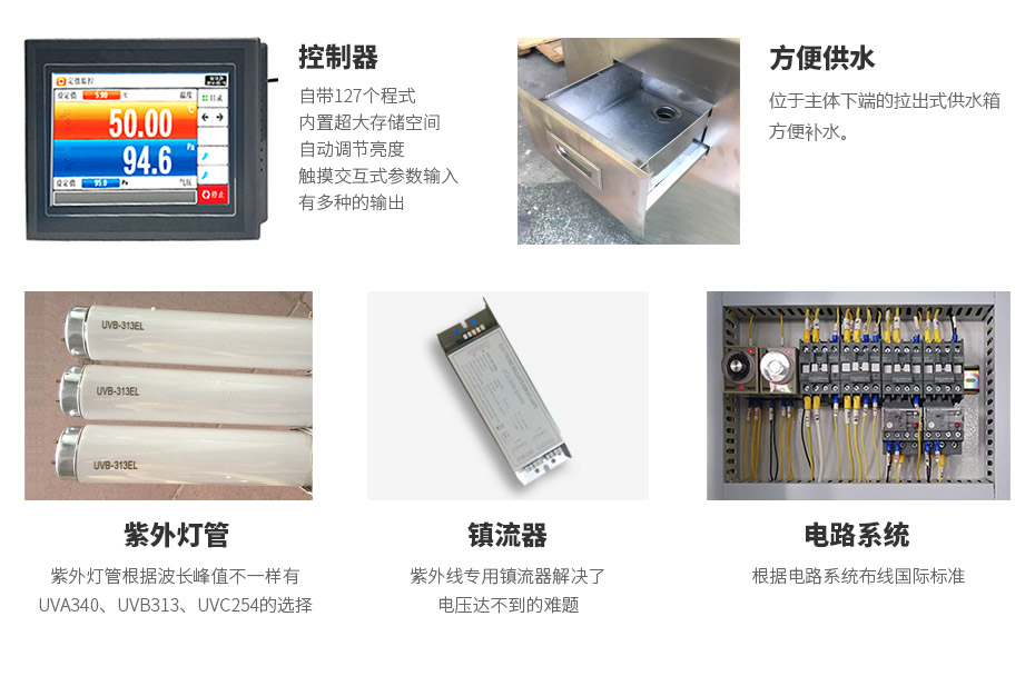 | 辐照灯管 | 美国进口UVA-340灯管*8支 | |||||
