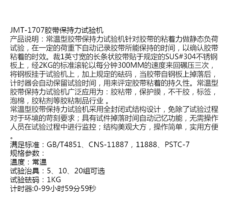 常温型胶带保持力试验机采用全封闭式结构设计,免除了试验过程对于环境的苛刻要求;具有试件掉落时间自动记忆功能,无需操作人员在试验过程中进行监控;结构美观大方,操作简单,实用方便。