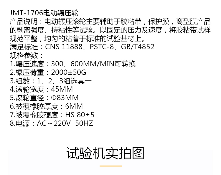 1、电动辗压滚轮主要辅助于胶粘带,保护膜,离型膜产品的剥离强度、持粘性等试验。以固定的压力及速度,将胶粘带试样规范平整,均匀的粘着于标准的试验基材上。
