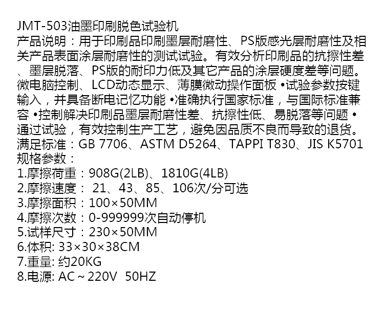 用于印刷品印刷墨层耐磨性、PS版感光层耐磨性及相关产品表面涂层耐磨性的测试试验。有效分析印刷品的抗擦性差、墨层脱落、PS版的耐印力低及其它产品的涂层硬度差等问题。