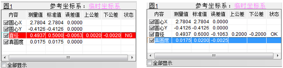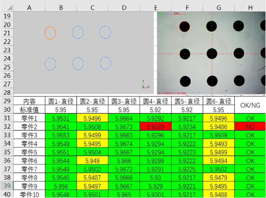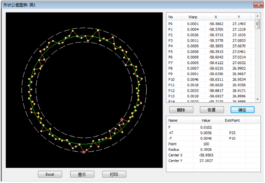 测量软件提供完整的公差设定和计算功能,可设定和计算形位公差,包括:直线度、圆度、平面度、圆柱度、轮廓度、位置度、平行度、垂直度、同心度、圆跳动等,并支持自动判断测量结果OK/NG,且具备NG警示功能。形象化的公差图表使用户可获知具体超差位置,方便查找超差原因。