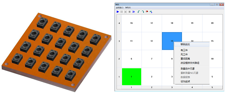 当测量大批量工件时,只需人为测量一个工件,即可通过工件阵列及阵列宏功能自动完成所有工件测量。无论单个夹具或者多个夹具,均能同时应对,可大大节省测量时间,提升测量效率。