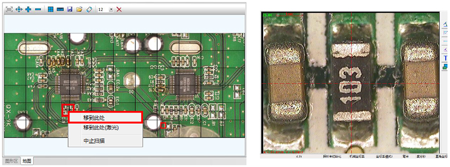 可利用软件功能控制运动机台,将工件整体扫描拼接成一张图片,也支持直接导入拍照获得的工件图片,并以该图片像素点为单位,精确定位工件位置。该功能可使运动机台迅速自动定位到任意细微局部位置,特别适用于大尺寸工件定位和具有大量类似特征的工件精确定位。