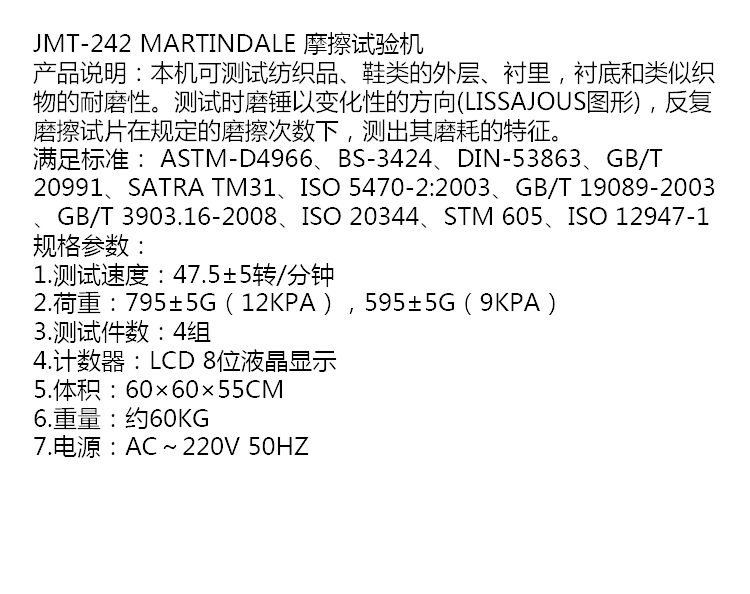 满足标准: ASTM-D4966、BS-3424、DIN-53863、GB/T 20991、SATRA TM31、ISO 5470-2:2003、GB/T 19089-2003、GB/T 3903.16-2008、ISO 20344、STM 605、ISO 12947-1