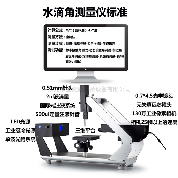 | 接触角测量 | 范围:0 ~ 180° | 精度:< 0.1° | 分辨率:0.001° | 重复测量精度:0.001° |