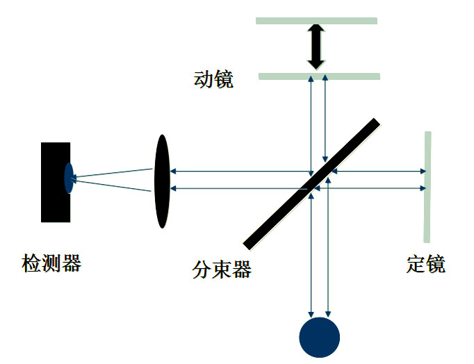 光源发出的光被分束器(类似半透半反镜)分为两束,一束经透射到达动镜,另一束经反射到达定镜。两束光分别经定镜和动镜反射再回到分束器,动镜以一恒定速度作直线运动,因而经分束器分束后的两束光形成光程差,产生干涉。干涉光在分束器会合后通过样品池,通过样品后含有样品信息的干涉光到达检测器,然后通过傅里叶变换对信号进行处理,最终得到透过率或吸光度随波数或波长的红外吸收光谱图。